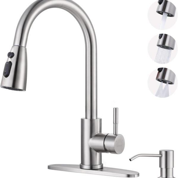 Kitchen Faucet with Soap Dispenser: 304 Stainless Steel Kitchen Sink Faucet with Pull Down Sprayer 3 , Single Handle High Arc Mixer Taps for Sink, RV, Laundry, Bar (Brushed Nickel)